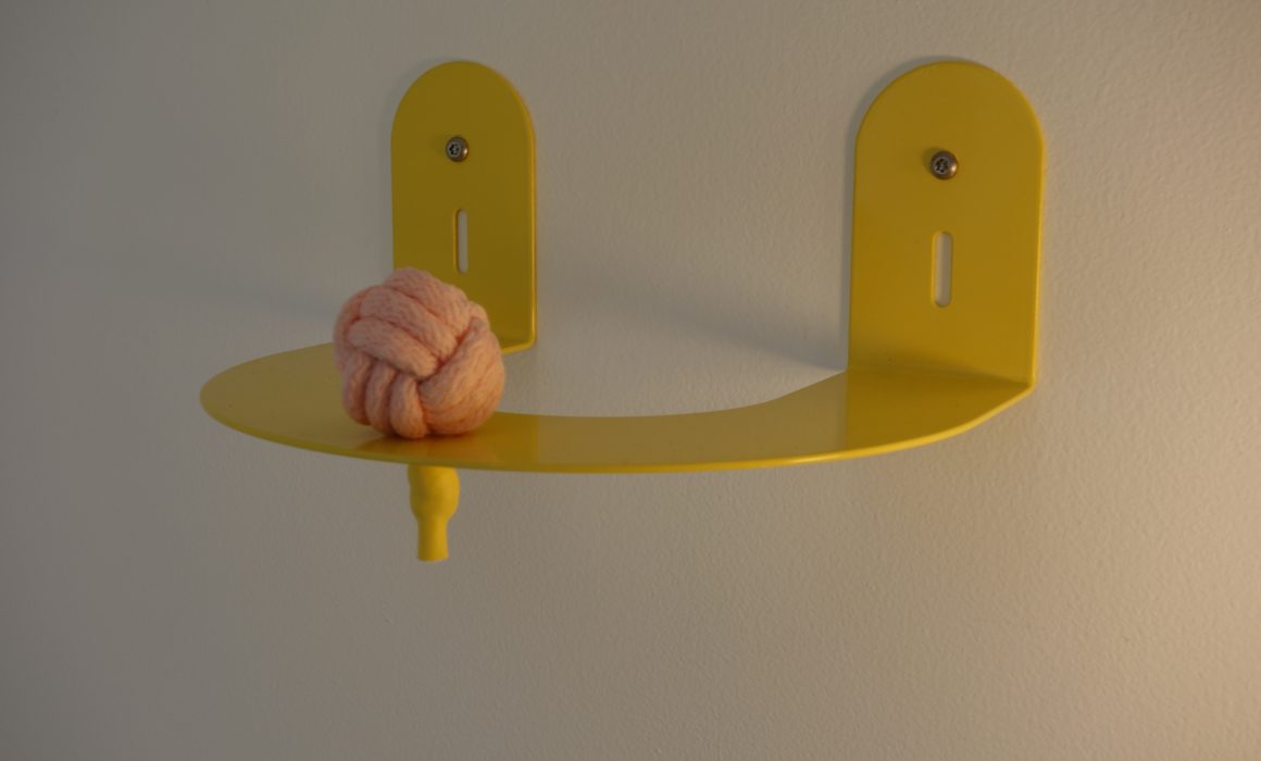 This exhibition makes use of a line that travels around the gallery, becoming an organising device that supports work and integrates it with the architecture. The resulting interior environment sits somewhere between the Weiner Werkstatte’s notion of the Gesamtkunstwerk or ‘total work of art,’ which sought to create a unified aesthetic across a designed environment, and Adolf Loos’ and the Bauhaus’ rejection of the Werkstatte’s decorative tendencies in favour of a stringent functionalism. The line here is functional: it supports works physically and unifies different types of work. It is not, however, immune to decorative flights of fancy: the decorative nature of the line transforms the ‘white cube’ of the gallery, softening it and giving it a slightly more domestic feel. .