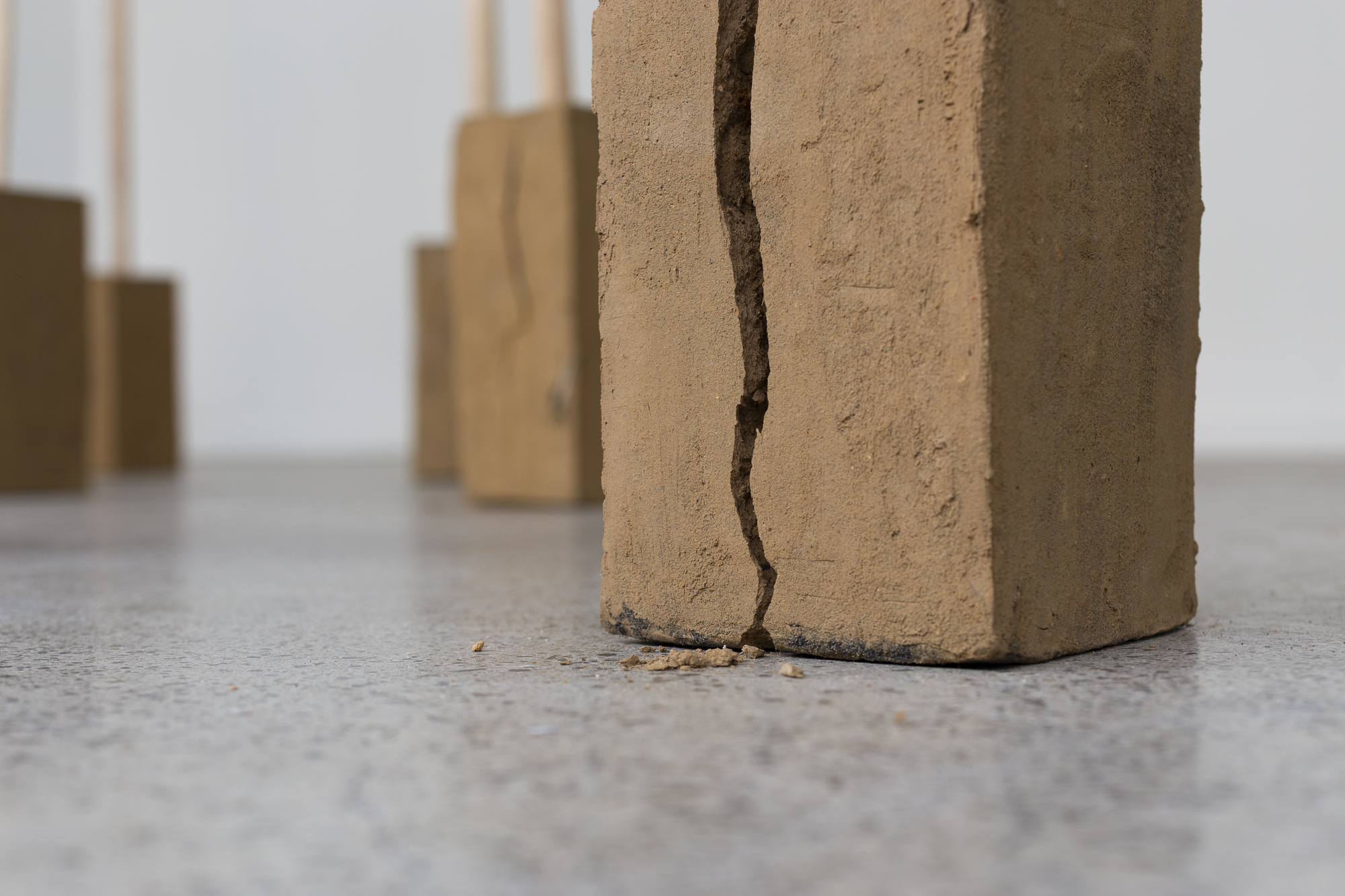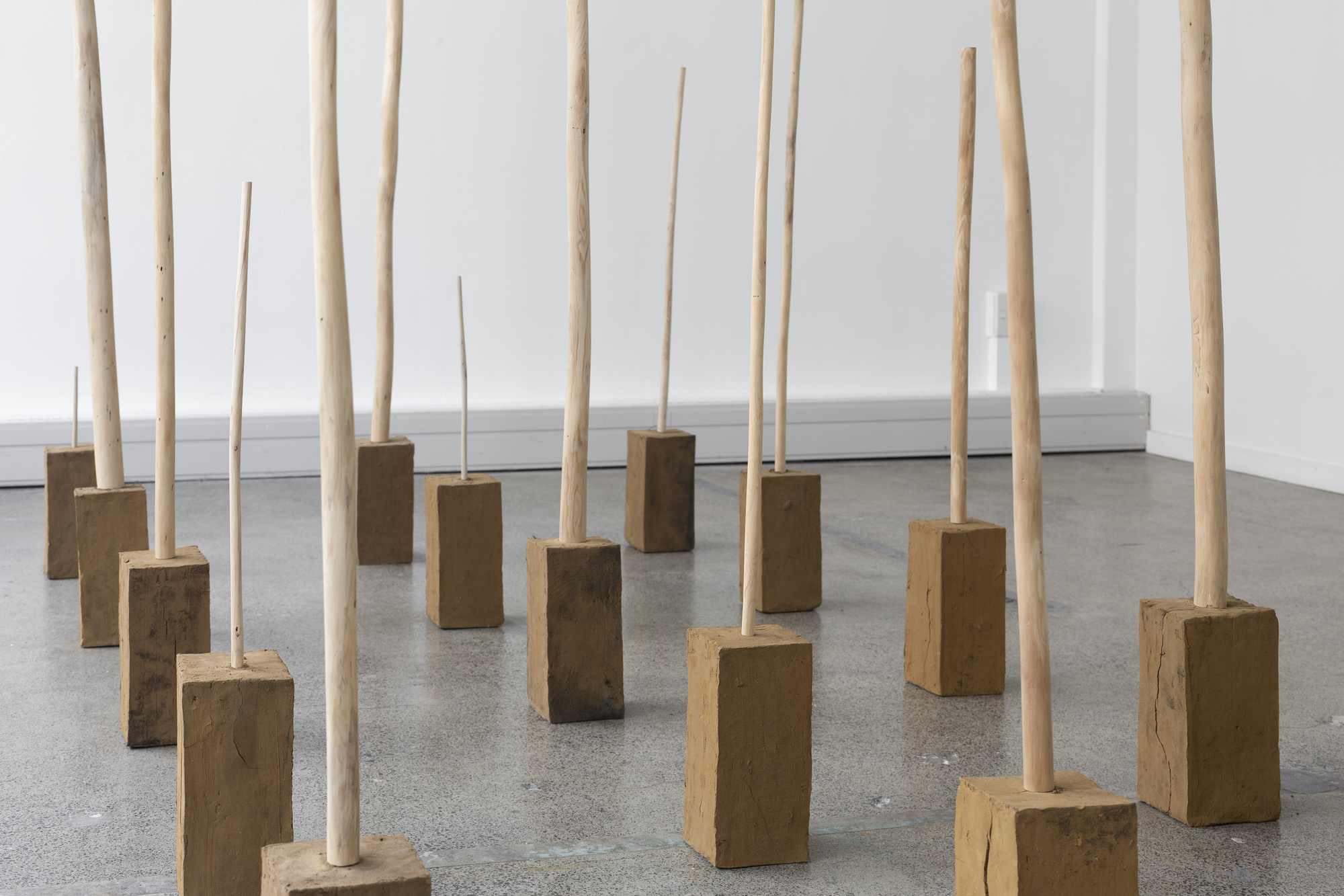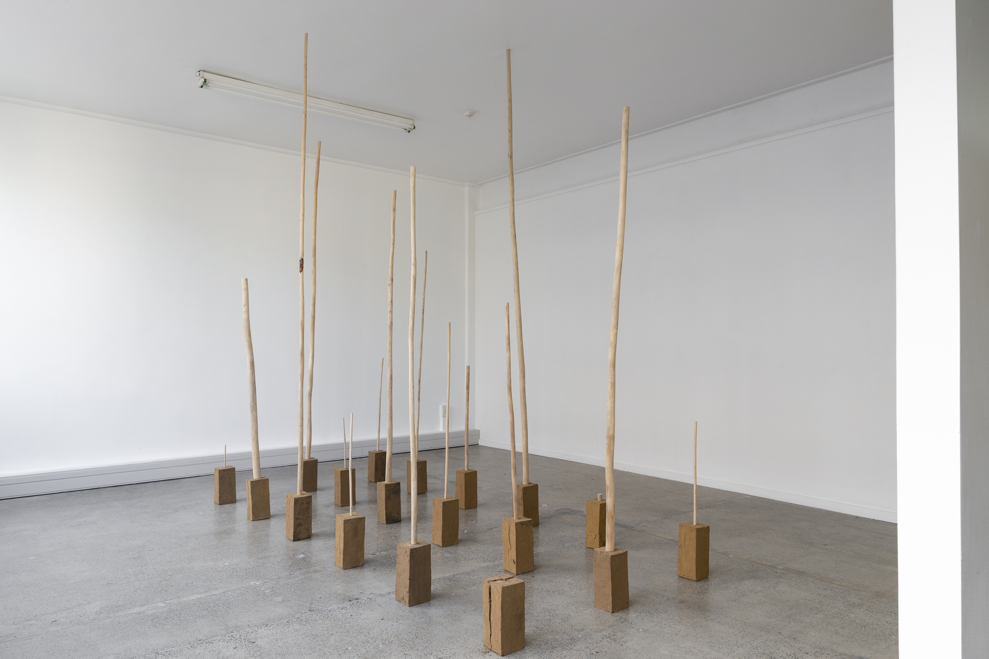 Goldies Grove reflects on the colonial implications of Goldies Bush, with its history of mass kauri deforestation and the ongoing effects of the soil-borne pathogen, kauri dieback. The installation is made from found uku and fallen kauri. These treasured raw materials were collected and processed on the land Jude Stevens grew up on, located in Muriwai, bordering Goldies Bush. Acknowledging Te Kawerau ā Maki, the tangata whenua of Goldies Bush and Auckland’s west coast, the materials of this installation will return to the land.