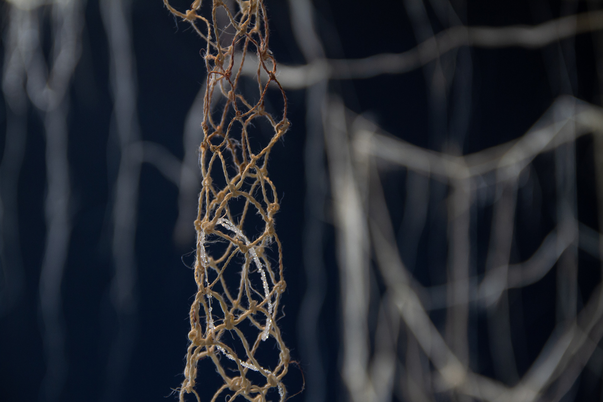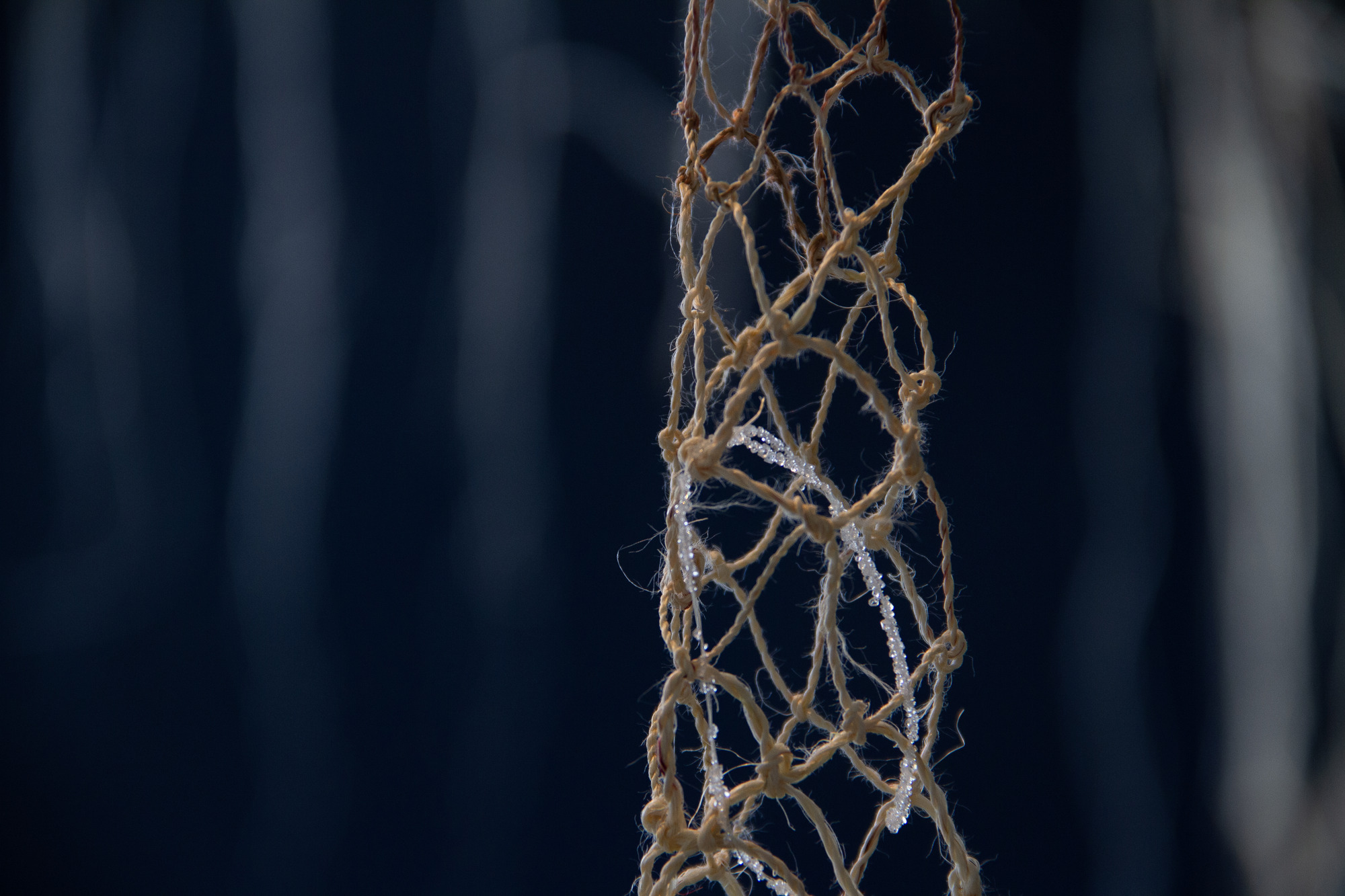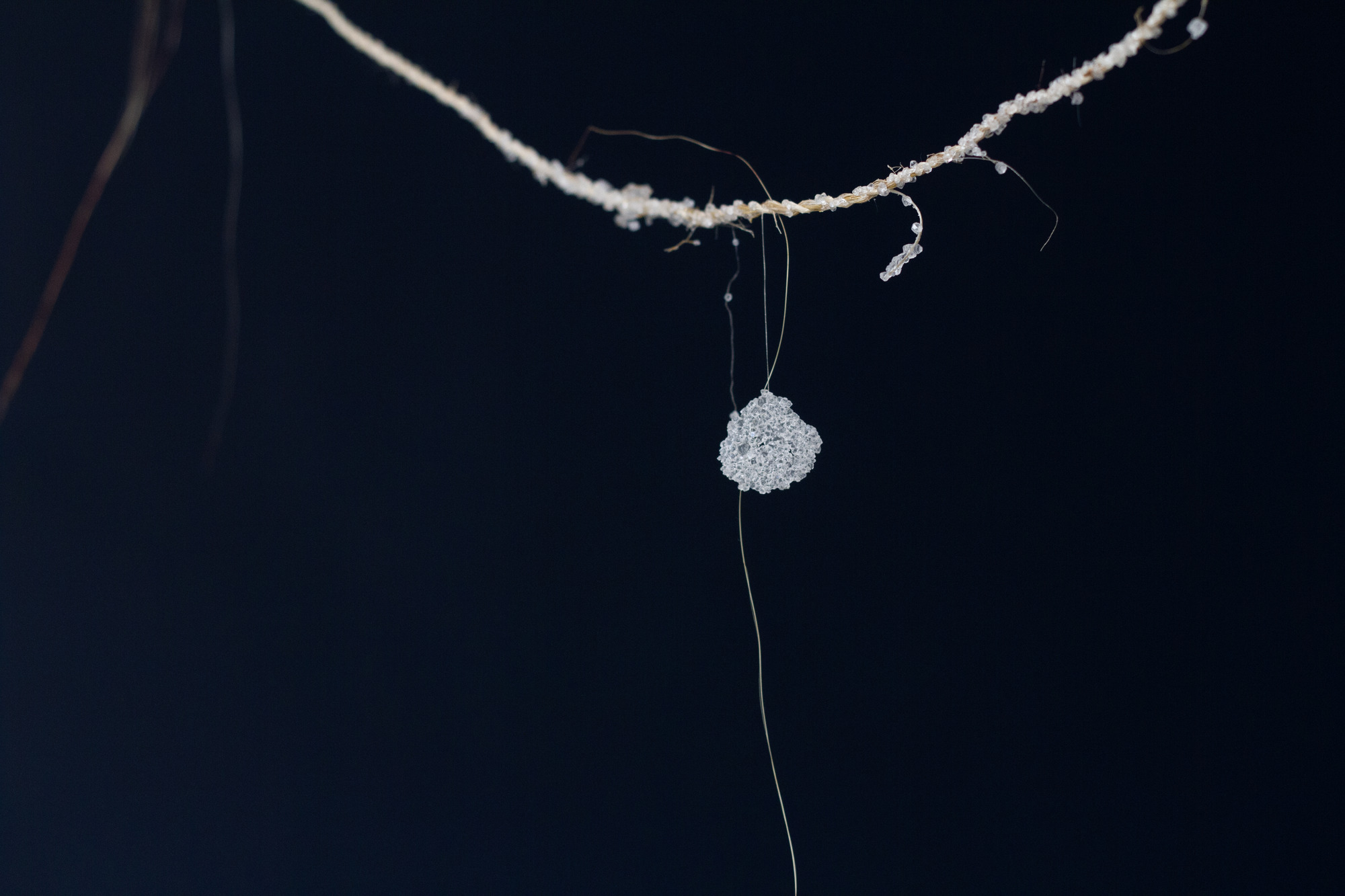 The materials chosen for this installation connect ancient Maori-Moana-nui-a-Kiwa traditions with contemporary practices, encapsulating the historical and cosmological narratives embedded in kōwhatu and stars. We show alignment to contemporary praxis by modes of aho (genealogy and illumination) and modern crystal formulation, utilising alum – this modernity paired with traditional methods of whatu and stone work aims to pull the viewer into an understanding of whakapapa whetu through both a motif of Atuatanga¹ and remembrance to wayfinding.